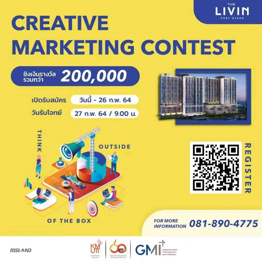 -Creative Marketing Contest เปิดกว้างสำหรับนิสิต นักศึกษา และบุคคลทั่วไป ทุกเพศ ทุกวัย แข่งขันประกวดทำสื่อทุกชนิด ไม่ว่าจะเป็น คลิปวีดีโอ Artwork Ads ชิงเงินรางวัล มูลค่ารวม 200,000 บาท