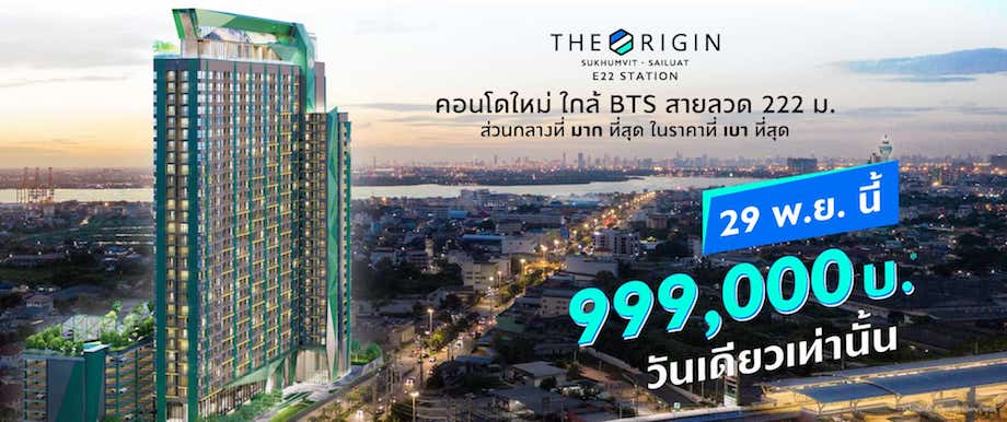 22.22.22 !!!! คือโอกาสในการลงทุนคอนโดมิเนียมราคาไม่ถึงล้าน ติดรถไฟฟ้าพร้อม SKY FACILITY :THE ORIGIN SUKHUMVIT – SAILUAT E22 STATION